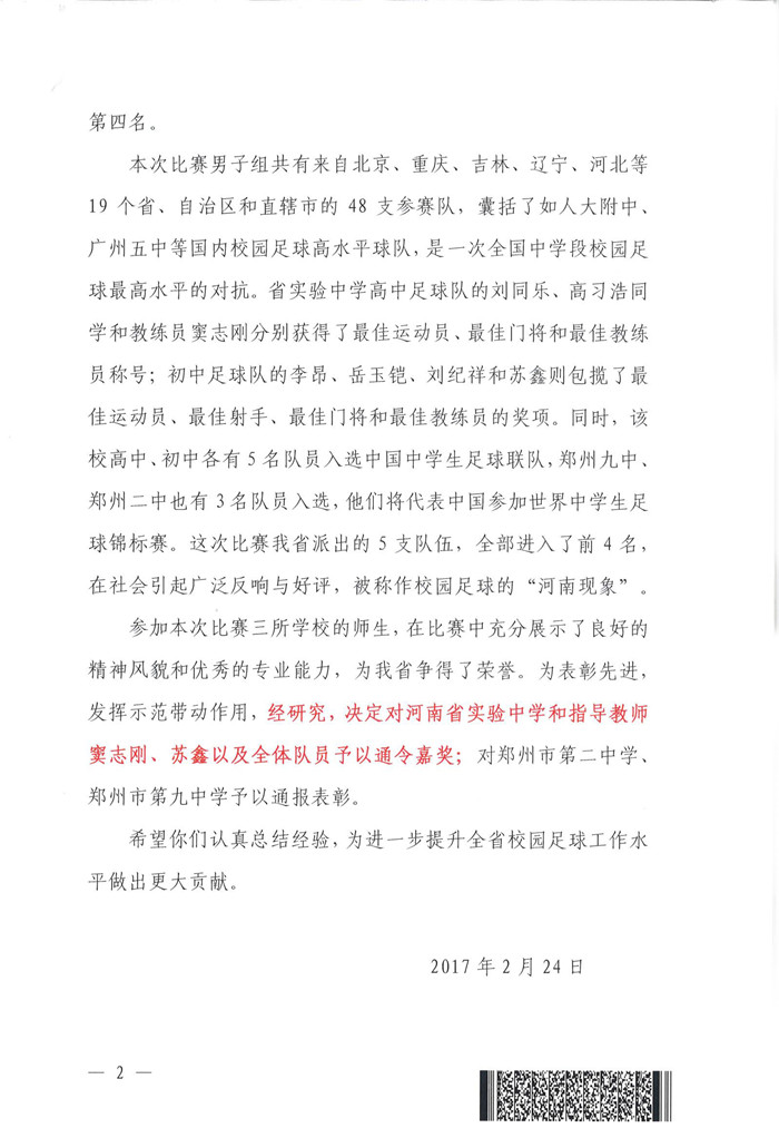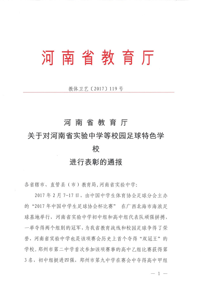 2月16日,“2017中国中学生足球协会杯”决赛在广西北海市海浪足球基地顺利结束。我校初中组2:1逆转北京回民中学,获得冠军。高中组3:0完胜厦门二中,再夺一冠,成为双冠王!这也是中学生协会杯历史上首支“双冠王”球队。河南省教育厅决定对我校和指导老师以及全体队员予以通令嘉奖。