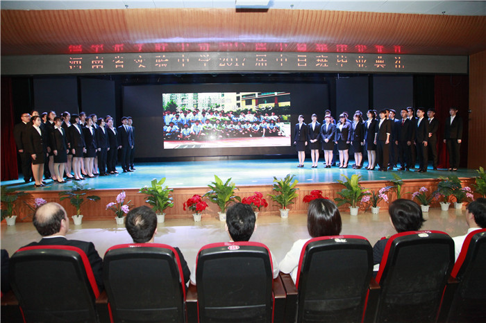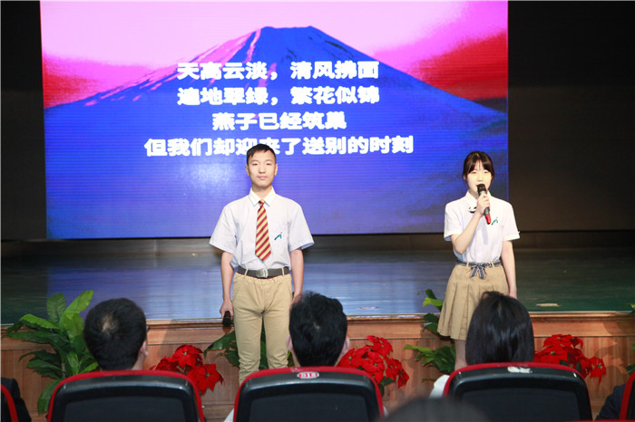 在日留学的上届学长为学弟学妹们发来贺电,高二学生代表向学兄学姐们送上诚挚祝福,老师们也以独特的方式送来温馨的寄语。高三毕业生代表用流利的日语深情地向学校、老师和家长们致以深深的谢意。典礼最后,全体毕业生深情合唱《心的旋律》,把三年的实验情结深深铭记在自己的记忆里。