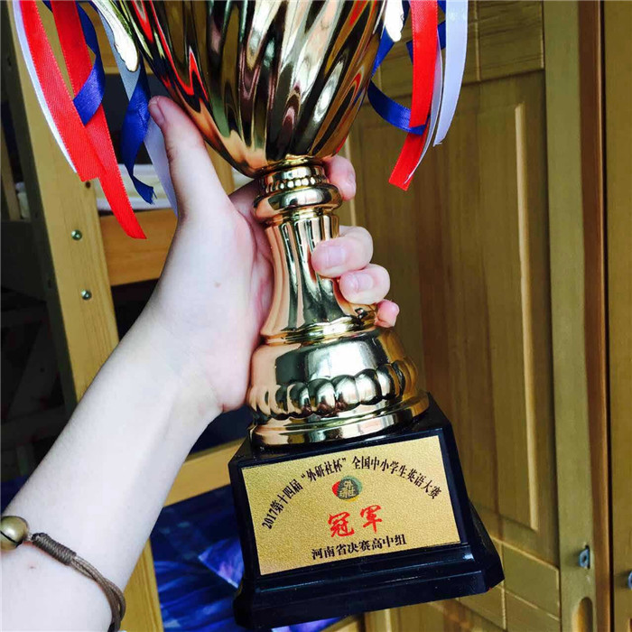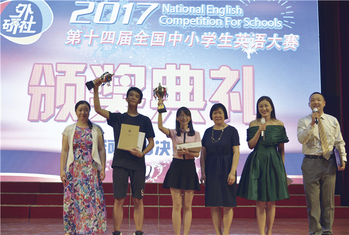 我校学生在2017年第十四届“外研社杯”全国中小学英语大赛中过关斩将,力克强敌,取得优异成绩。高一(6)班陈泓霏同学夺得河南赛区高中组冠军,初二(3)班翟亦飞同学获得河南赛区初中组亚军。两位同学将代表河南参加今年七月份在北京举行的全国决赛。