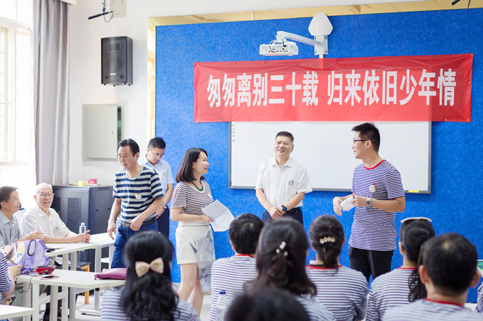 上午八点半,同学们怀着近乡情更怯的心情齐聚在实验中学的校史馆(当年的八角教学楼)大门前。他们中既有河南本地的同学,也有来自外省市的同学和从海外归来的游子,大家激情相拥、互话思念,而当见到几位已白发苍苍却仍能叫出同学们姓名的离退老师时,大家仿佛又回到了青葱岁月,围着老师们叽叽喳喳聊个不停…...大家聚集在校史馆前合影留念,而后在当年的班主任刘增文老师的带领下,大家参观了校史馆,不时为找到当年的照片、发现一个熟悉的映像而欢呼。九点半,所有同学和老师进入校史馆一楼教室,身穿统一的海魂衫,仿佛穿着当年的校服,举办了一场跨越30载的主题班会——匆匆离别三十载,归来依旧少年情。大家重温了“为革命保护视力”的眼保健操,邀请各位老师深情寄语,表演了能够表达此时此刻心情的手语舞蹈“感恩的心”,实时连线视频跟远方未归的同学们交谈,共同回忆当年发生的趣闻轶事……