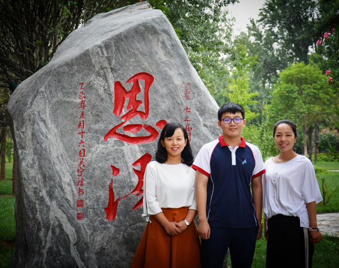 孙泽(左二)与英语老师罗红杰(左三)、班主任王勤老师(左一)合影