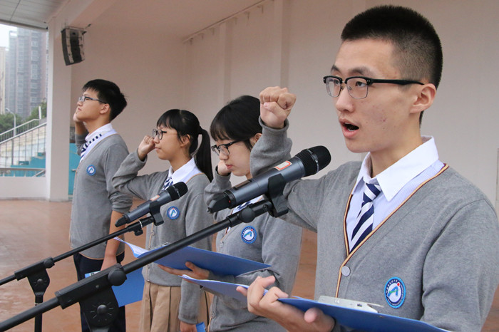 接下来,在主持人的引导下,全体同学举起右拳,发出共同的实验誓言:我们永远深爱自己的祖国,∥不负青春,不负使命,∥以赤子之心担当国家未来;∥我们坚持思想独立,∥勤于思考,勇于实践,∥永葆求变创新之志;∥我们敢于迎接挑战,∥面向世界,胸怀天下,∥发奋努力,追求卓越。∥我们立志成为身心健康、∥充满自信、∥具有创新意识、∥进取精神∥和领导潜质的杰出公民!