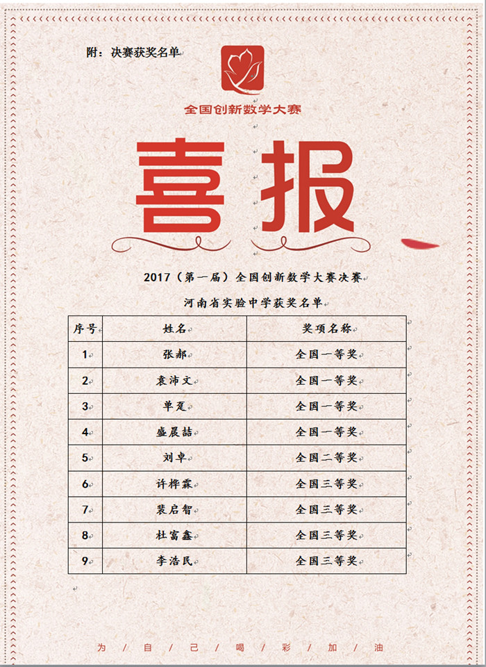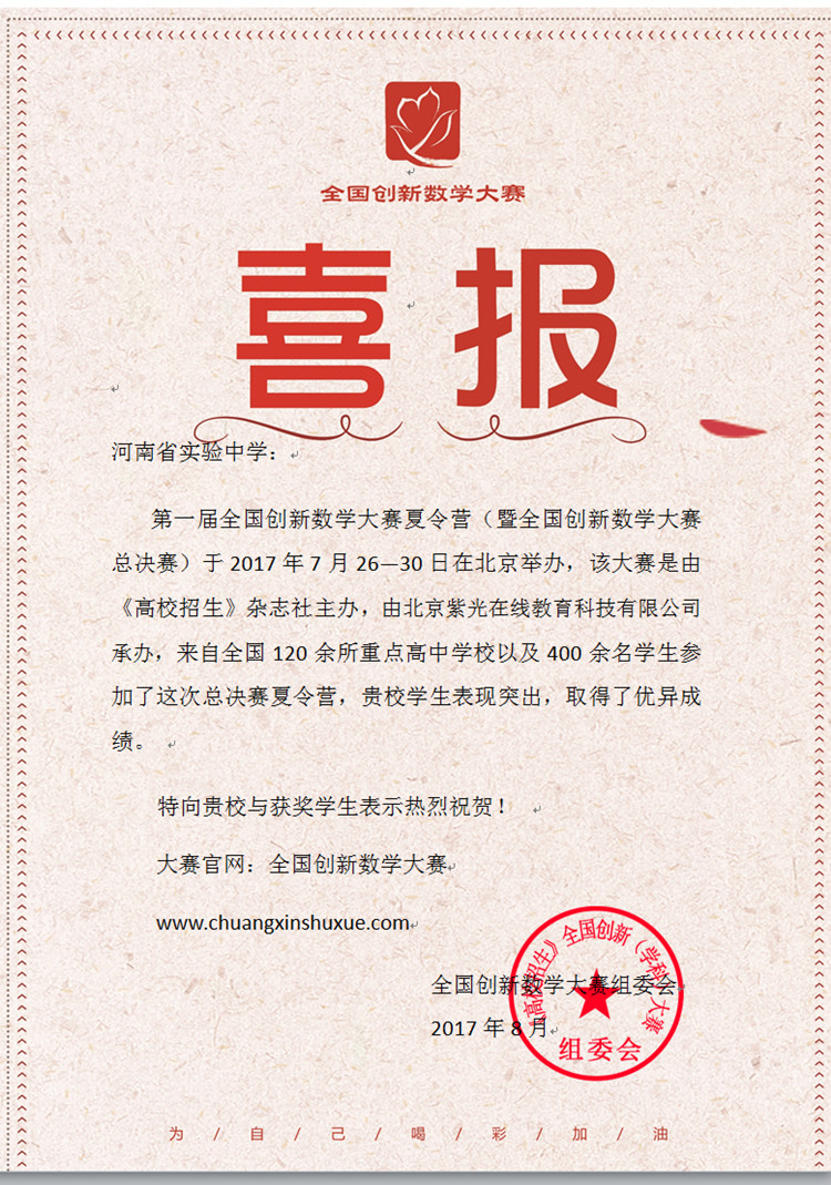 第一届全国创新数学大赛夏令营(暨全国创新数学大赛总决赛)于2017年7月26—30日在北京成功举办。我校共有四名同学获得全国一等奖。