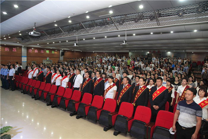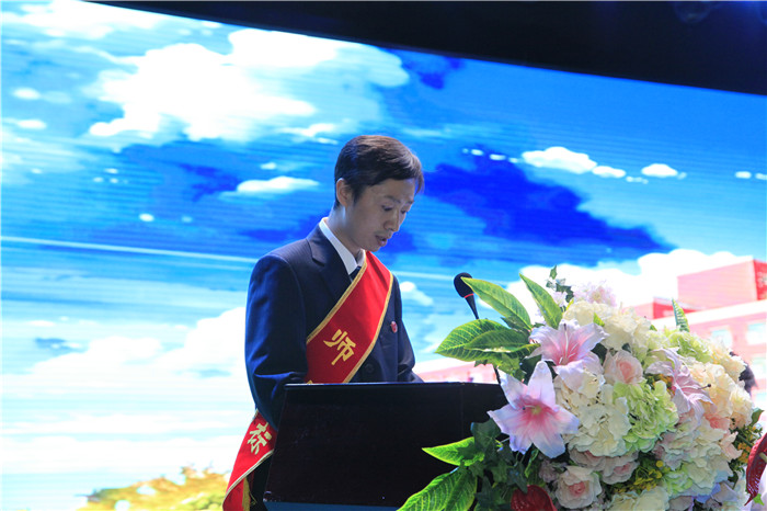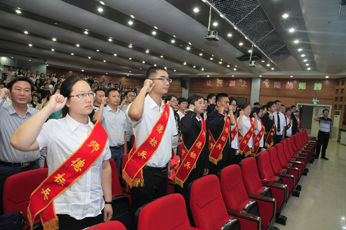 会上,“特别贡献奖”获奖代表郭凌云和“师德标兵”代表吴水红、岳鹏、韩婷四位教师作了做典型发言。郭凌云老师所带的班级在2017年高考中取得优异成绩,不仅培养出郑州市理科状元刘天毅,而且郭老师所教两个班的高考英语成绩140分以上人数达到42人,几乎全部同学都达到130分以上。成绩取得离不开郭老师对学生的用心陪伴和深情付出。四位教师代表的发言,真实质朴,感人至深,他们没有惊天动地的事迹,只是将平凡的工作做到了极致;他们没有光辉高大的形象,只是将师德师范变成了人生的信条;他们没有指点江山的气魄,只是将三尺讲台站成了精神的圣地。他们用自己高尚的师德和十几年如一日的坚守诠释了省实验中学教师群体的集体风尚。精神的共鸣被时时唤醒,内心的感动更让人动容,现场很多老师被感动得热泪盈眶。在掌声和泪水中,会场气氛被一次次推向了高潮。随后,在这种温馨、温暖的气氛中,全体教职工进行了重温《教师誓词》的宣誓仪式,大家举起右拳面对国旗发出的铮铮誓言,在报告厅久久回荡。