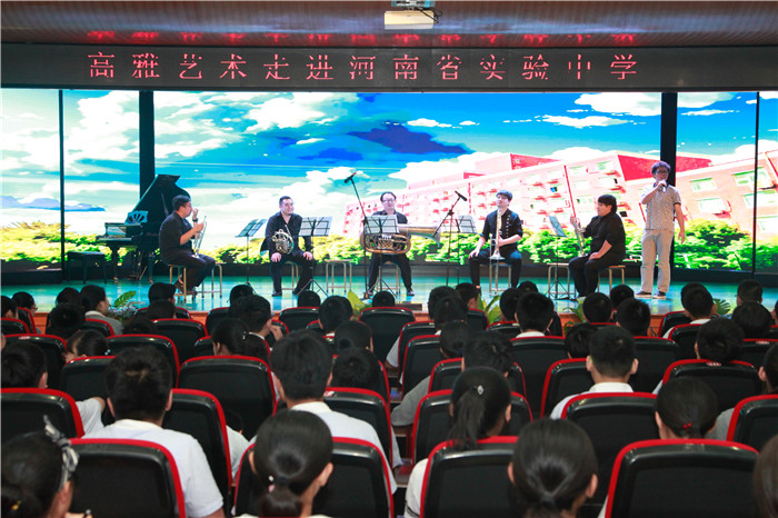 2017年9月14日,河南省交响乐团的演奏家们再次走进河南省实验中学,为同学们献上精彩演出。上午9:30分,报告厅内坐满了来自初一、初二、高一年级部分班级的同学,学生们近距离地了解了交响乐团中常用的乐器,欣赏了包括《弦乐小夜曲》、《美国巡逻兵》、《天空之城》、《千与千寻》、《哈尔的移动城堡》、《四小天鹅舞曲》、《中国儿童歌曲串烧》等数十首耳熟能详的作品。整个演出过程,同学们全神贯注,静静感受高雅艺术的魅力,每一曲演奏结束,大家都由衷地报以热烈的掌声。