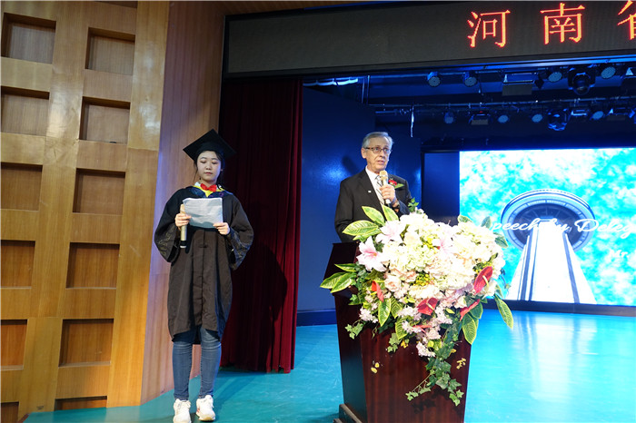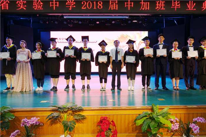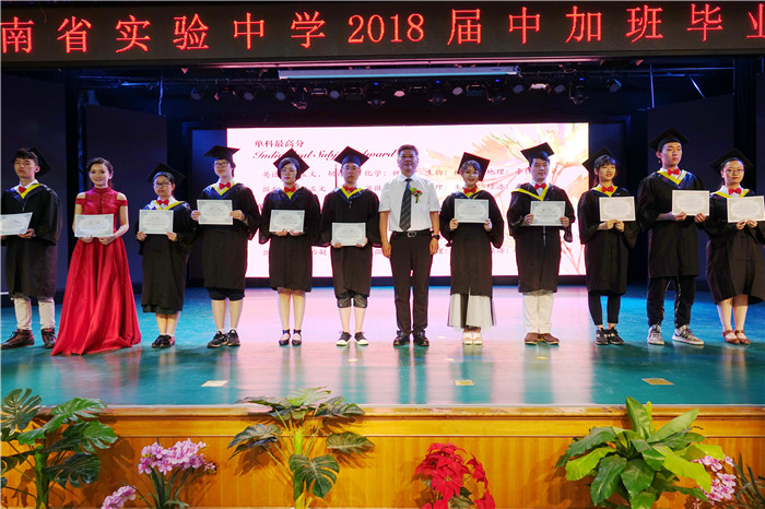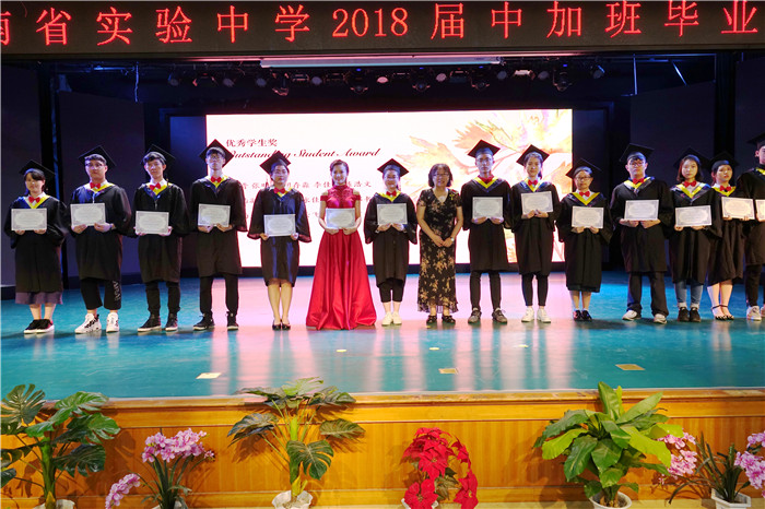 音乐声中,校长马玉霞和加方校长辛普森上台为毕业生颁发中加两国高中毕业证并与学生合影留念。国际部主任牛炳华宣读了受表彰学生名单,派特森教育集团总经理刘民民,我校副校长王献甫、杨东升、殷红等领导为获得优秀学生奖、得力助手奖、突出贡献奖、单科最高分奖和单科最大进步奖的毕业生颁发了荣誉证书。