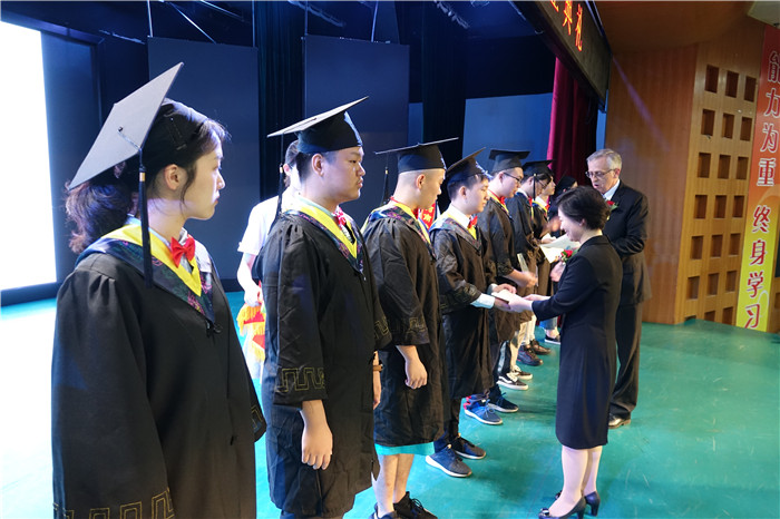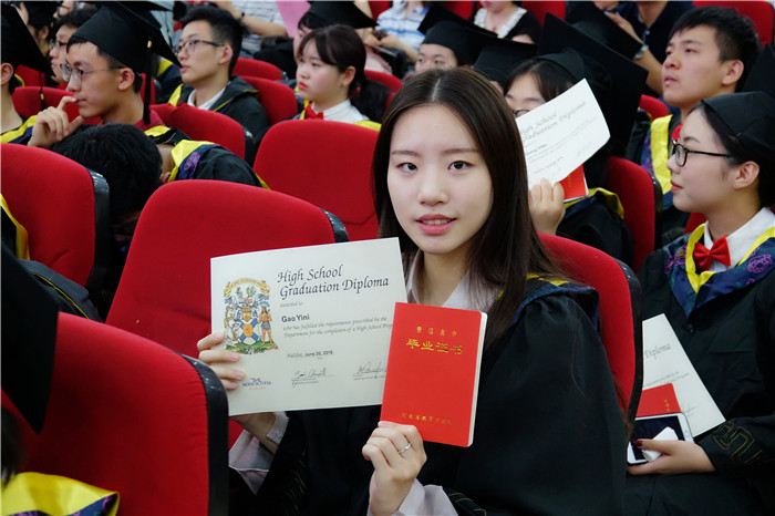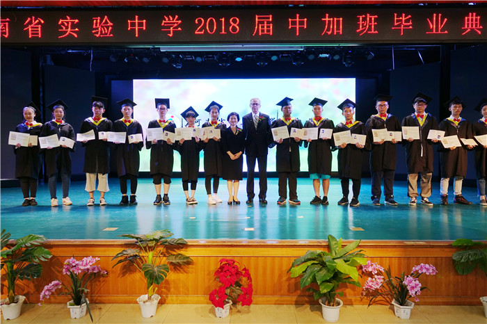 校长马玉霞和加方校长辛普森为毕业生颁发中加双方高中毕业证并合影留念