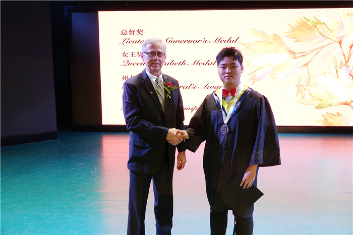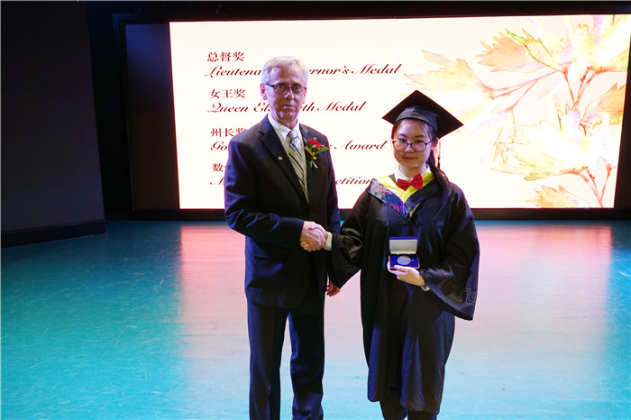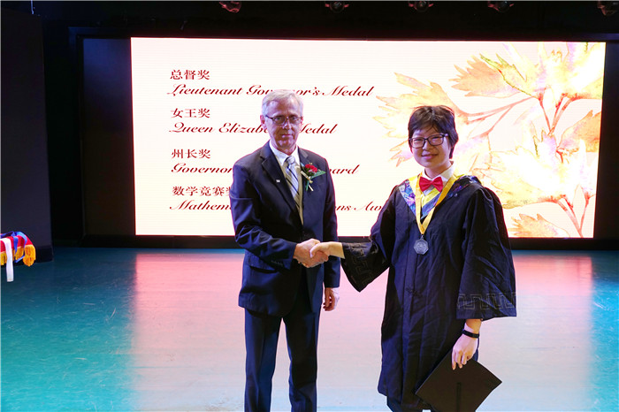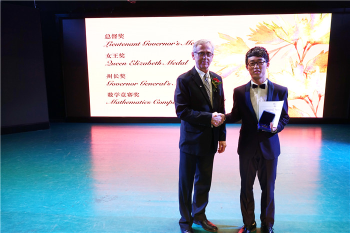 加方校长辛普森、副校长黛比佩林为高二年级张丹凝和冯怡伟两名同学颁发了加拿大总督奖,并分别为高三年级张雨柔同学、祝孟文同学颁发了女王奖和州长奖,以上三种奖项代表中加班学生获得的最高荣誉。在今年的数学竞赛方面,中加班同学也有斩获:刘欣然同学获得滑铁卢大学加拿大高级数学竞赛冠军奖牌,王竟成同学获得滑铁卢大学欧几里德数学竞赛冠军奖牌,张桐堃同学获得多伦多大学开放数学挑战赛金奖。这些重要奖项的获得,代表我校国际部中加班学生的学习能力和综合素质得到了加方的高度认可,也为他们申请世界一流大学准备了条件。