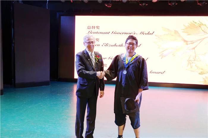 加方校长辛普森为高三祝孟文同学颁发州长奖