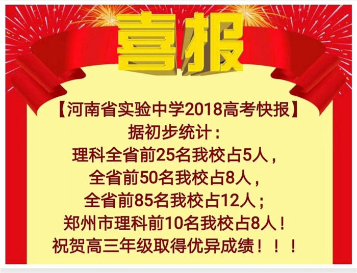 很多人可能对拥有近百万考生的河南省全省排名没有清晰的认识,但“郑州市理科前10名占8人”的成绩足以让人惊掉下巴:“这学校真牛!”“简直是实力碾压!”,当然也有人质疑:“数据可靠吗?”随后,河南省教育厅官方公布的“2018年河南省普通高招分数段统计表”瞬间让所有质疑变成敬服!后经过更准确、详尽的统计,河南省实验中学2018年普通高招成绩全面地展现在人们面前:2018高考,河南省实验中学理科、文科、航空部、艺体生等全面开花,均取得了优异成绩!理科全省前100名我校12人(郑州市前10名我校占8人),全省前500名、前1000名高分段人数我校均占郑州市近一半;文科全省前100名我校4人;达到清华北大录取线人数25人左右。