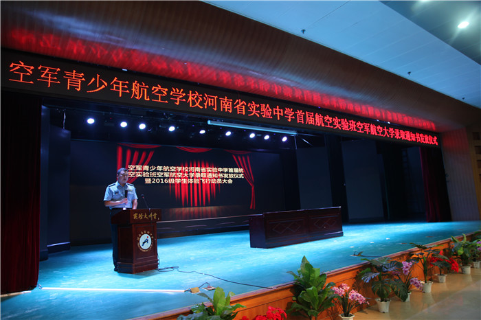 7月14日,河南省首届空军青少年航空学校空军航空大学录取通知书发放仪式在我校报告厅举行。通过三年的精心培养,由我校航空实验班首届41名毕业生被空军航空大学航空飞行与指挥专业录取,两名学生获得清华大学、北京大学和空军航空大学双学籍,培养数量和质量均位居全国前列。空军青少年航空学校办学项目在省实验中学初结硕果,实现了向空军批量输送优秀飞行后备人才的既定目标,教育梦和强军梦在我校灿烂盛开、交相辉映。