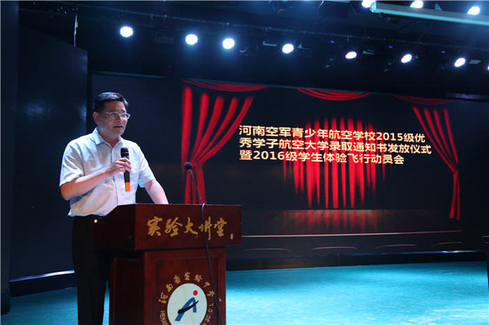 看到第一届航空实验班的同学们取得如此优异的成绩,听到穆伟主任亲自宣读的来自空军招飞局济南选拔中心的贺信,听到学生、家长代表的发言,作为校长,我感到非常高兴和骄傲。在此,我代表省实验中学全体师生向航空实验班的老师和同学表示祝贺,向大力支持航空班实验班发展的济南空军招飞局以及河南省教育厅表示衷心的感谢,向在背后默默付出的家长朋友们表示诚挚的敬意!