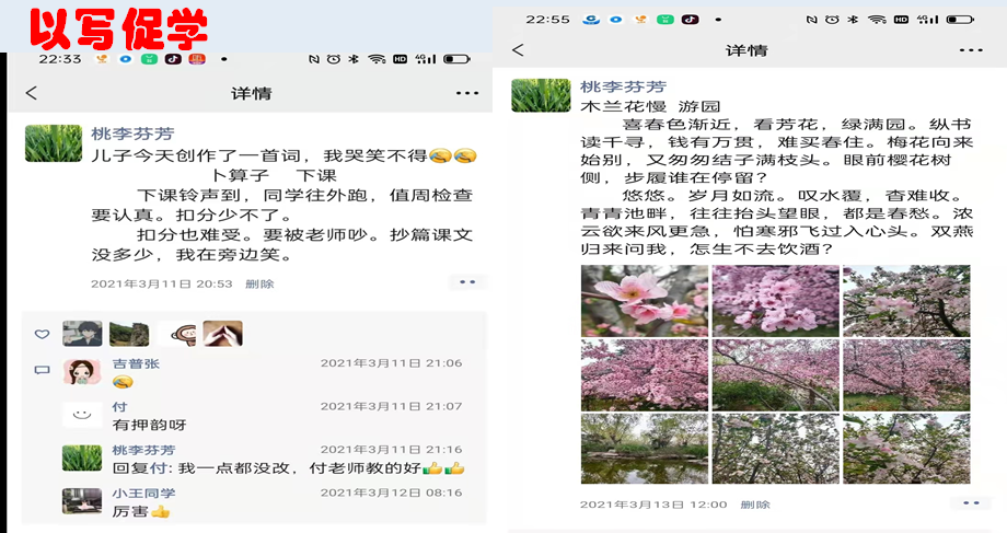 针对以上难题,刘老师也提出了一系列解决办法,如披文入情、反复吟咏、知人论世、品味“情”“景”、驰骋想象、以写促学。尤其是以写促学,刘老师还使用亲身例子,使用自己和儿子的作品,向大家展示了“以写促学”的重要性。