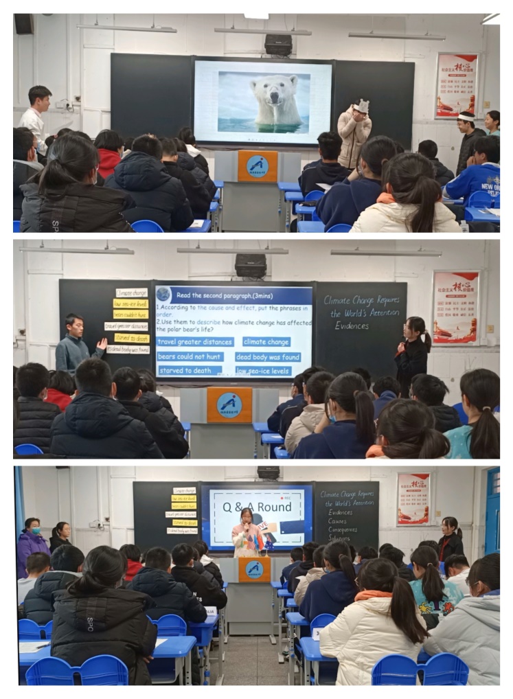 胡雪晴老师深入研究教材,分析文章结构,挖掘深层内涵,依据Evidences-Causes-Consequences-Solutions对文章进行讲解,并根据学生的年龄和学习特点,精心准备道具,设计了丰富多彩的课堂活动,其中包括角色扮演,画示意图,段落复述,模拟联合国等。课堂活动包括自主学习与合作学习,锻炼了学生的批判性思维和逻辑思维能力,提高了学生的环保意识和跨文化意识,突出学生主体地位。