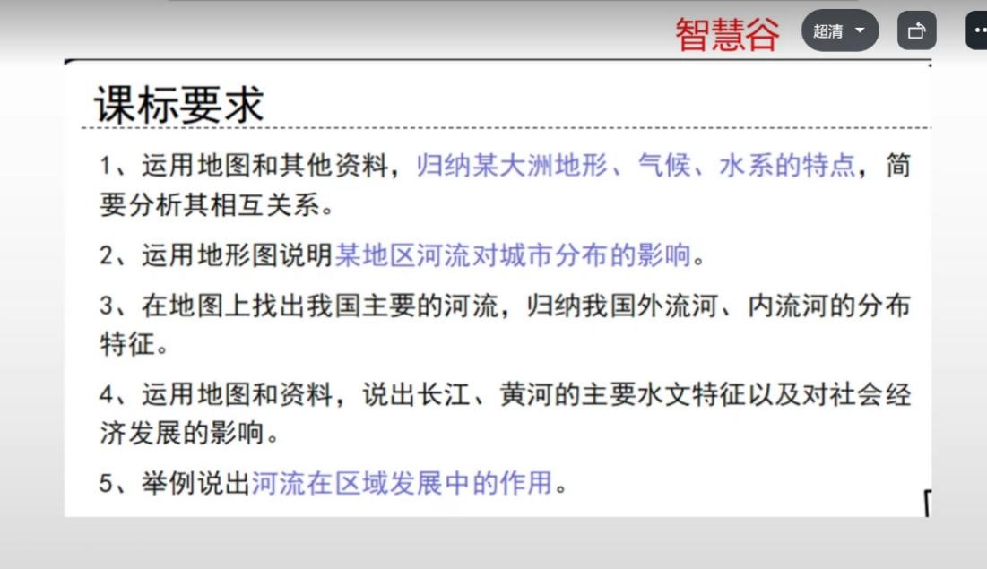随后,韩丽芳老师以河流专题为例进行了专题复习的讲解,河流专题的复习要点有三:主要河流的名称-在地形中填写、水文特征以及河流开发与治理。区域河流和地形之间脱不开关系,地形不仅影响河流的流速,还会对河流结冰期、航运价值产生重要影响,因此在分析河流特征前需要先描述地形的特征。韩丽芳老师指出,上述内容在课标要求中都有所展现,由此得出在进行专题复习前,必须要基于课标进行分析和讲授。