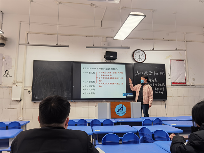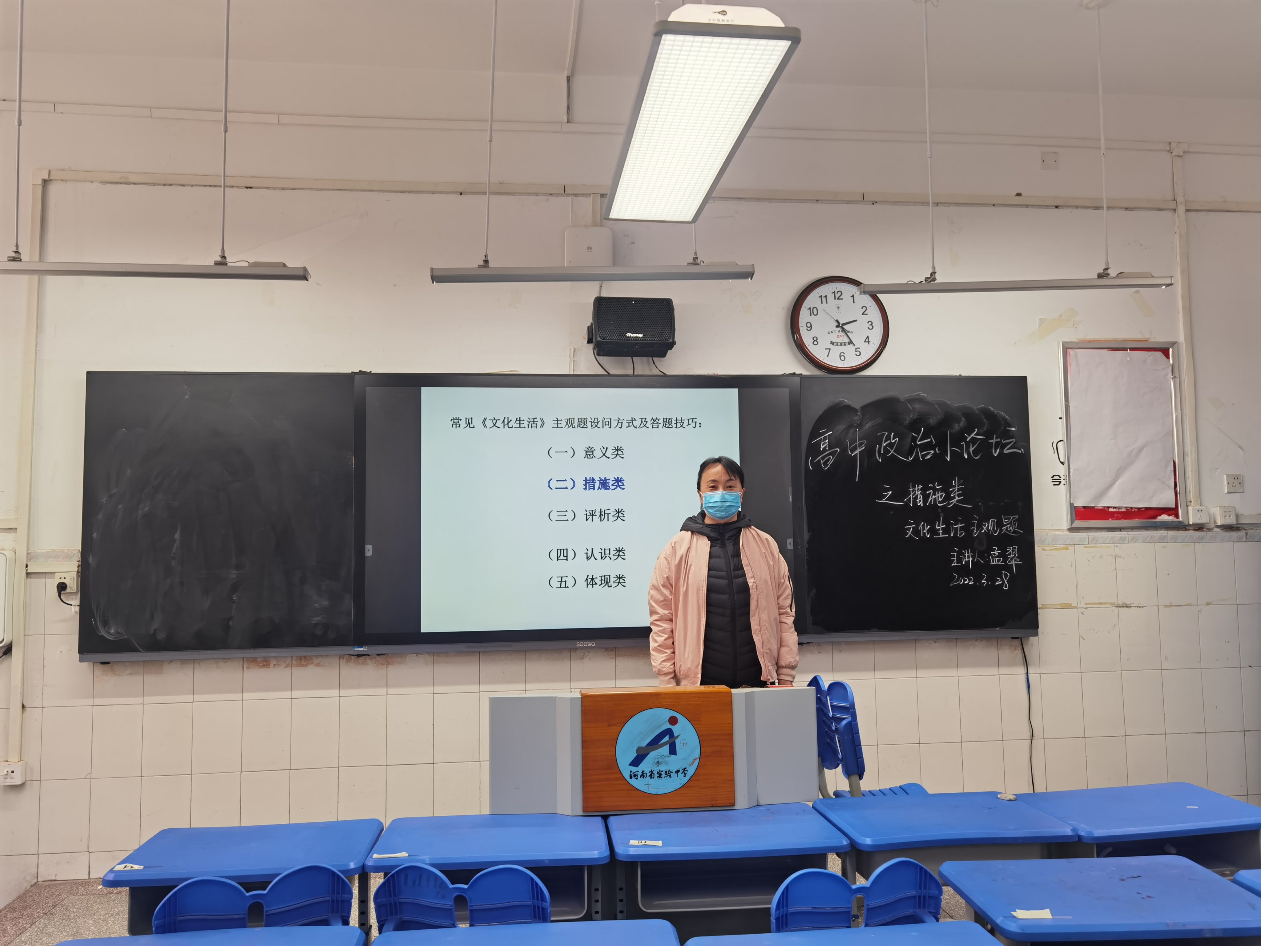 2022年3月28日下午,高中政治教研组在本部3204教室进行了“文化生活主观题”为主题的教研活动,本次小论坛是该系列的第二场,由高三备课组孟翠老师主讲“文化生活措施类主观题”的答题技巧,高中政治组全体老师共同参与了学习与研讨。