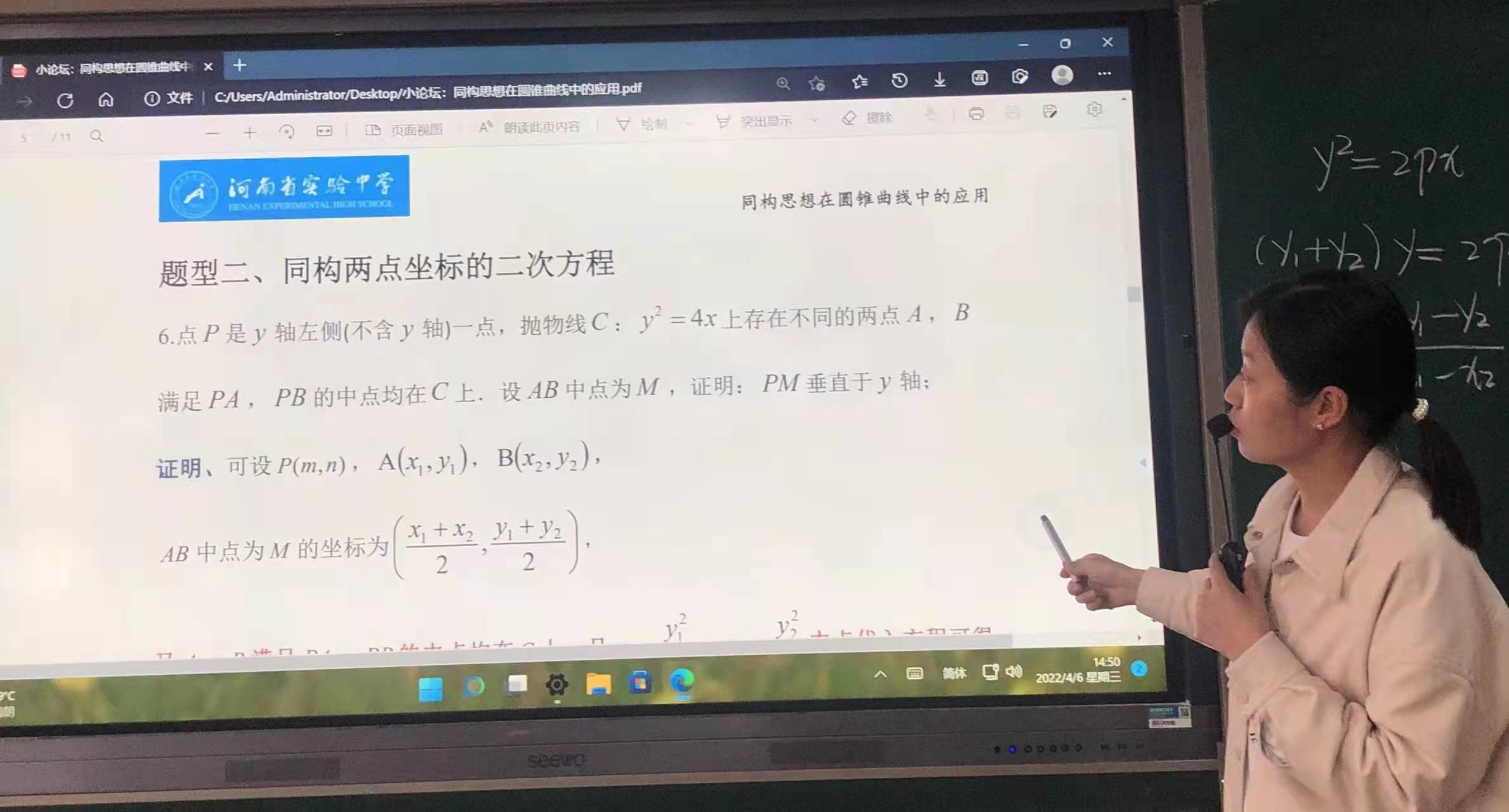 2022年4月6日下午,高中数学教研组在阶梯教室一进行“同构思想在圆锥曲线中的应用”专题教研活动,本次小论坛由高二备课组宋苗珂老师主讲。