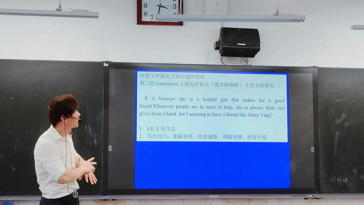 继而,来自本部初三年级的王千山老师围绕“基于大观念的英语跨学科特点在单元教学中的体现”这一论题,就理论探究和教学实例两方面展开分享。并通过基于单元整体教学促进学生写作能力和测试能力的教学实例对如何进行英语写作教学做了精准解读指导。然后教参会老师们如何去研究分析教材,确立教学目标,最后具体对写作教学进行了解析。