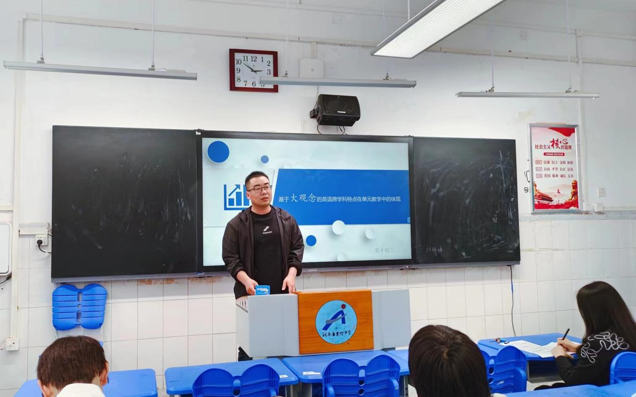 针对“基于大观念的英语跨学科特点在单元教学中的体现”这一论题,英才初三年级的段伟朋老师从主题引领、情景教学、核心素养四要素三部分展开了本期的英语学科论坛分享。他提出强调“大观念”以学科大概念为核心,使课程内容结构化,以主题为引领,使课程内容情境化。