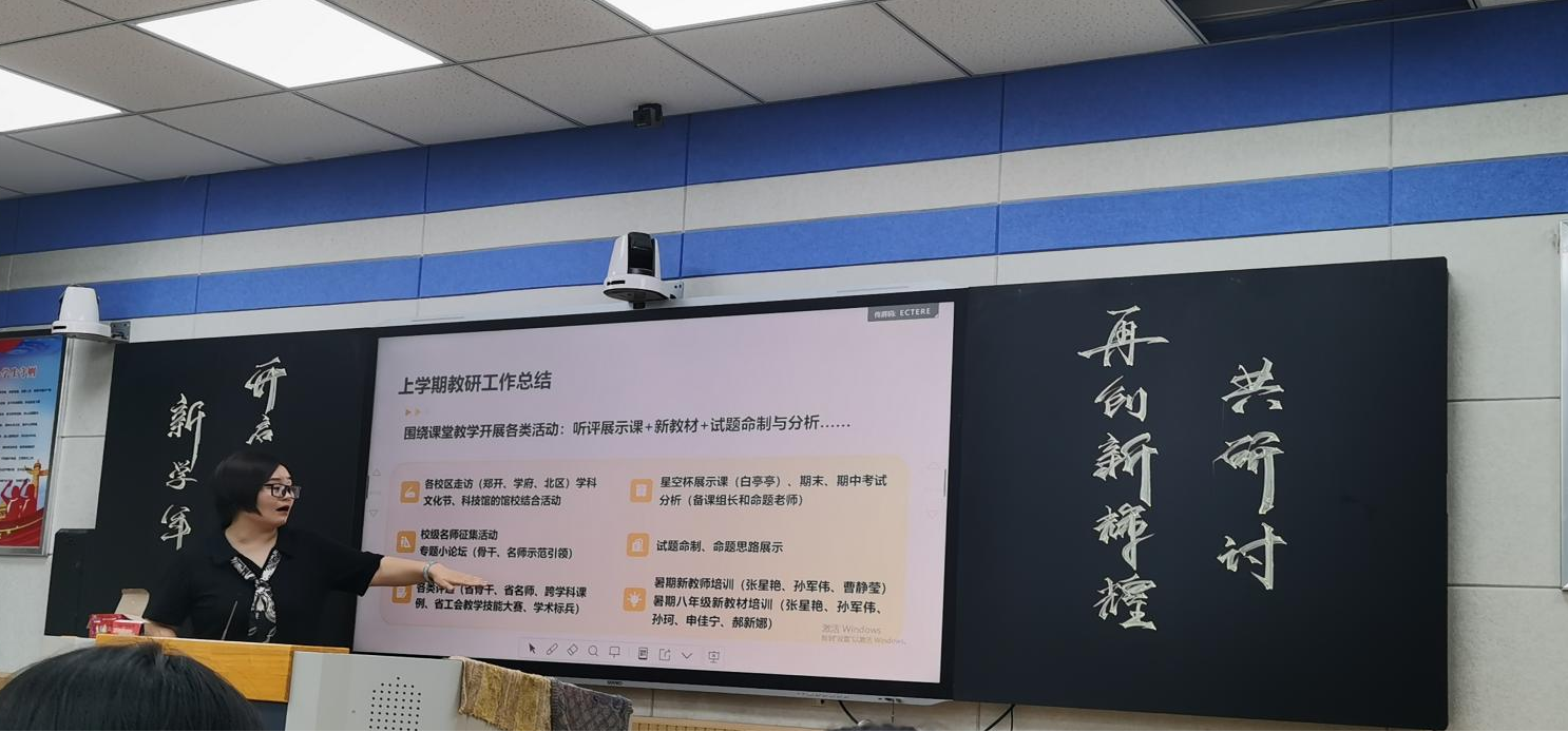 教研组长张星艳老师对上学年教研工作进行了全面总结,她指出,上一学年围绕课堂教学核心,有序开展了听评展示课、新教材解读、试题命制与分析等多项活动。在此基础上,为响应学校本学年工作要求,结合校历安排,延续并推进上学年未完成的骨干教师与名师示范引领工作,同时拟定了本学期周度教研工作计划。该计划涵盖多类重点任务,具体包括2025年中招试题讲评、中招评分标准解读、郑州市中招质量分析会参与、新教材统计板块解析、各校区 “星空奖” 教学新秀评选,以及期中考试分析与反馈等。