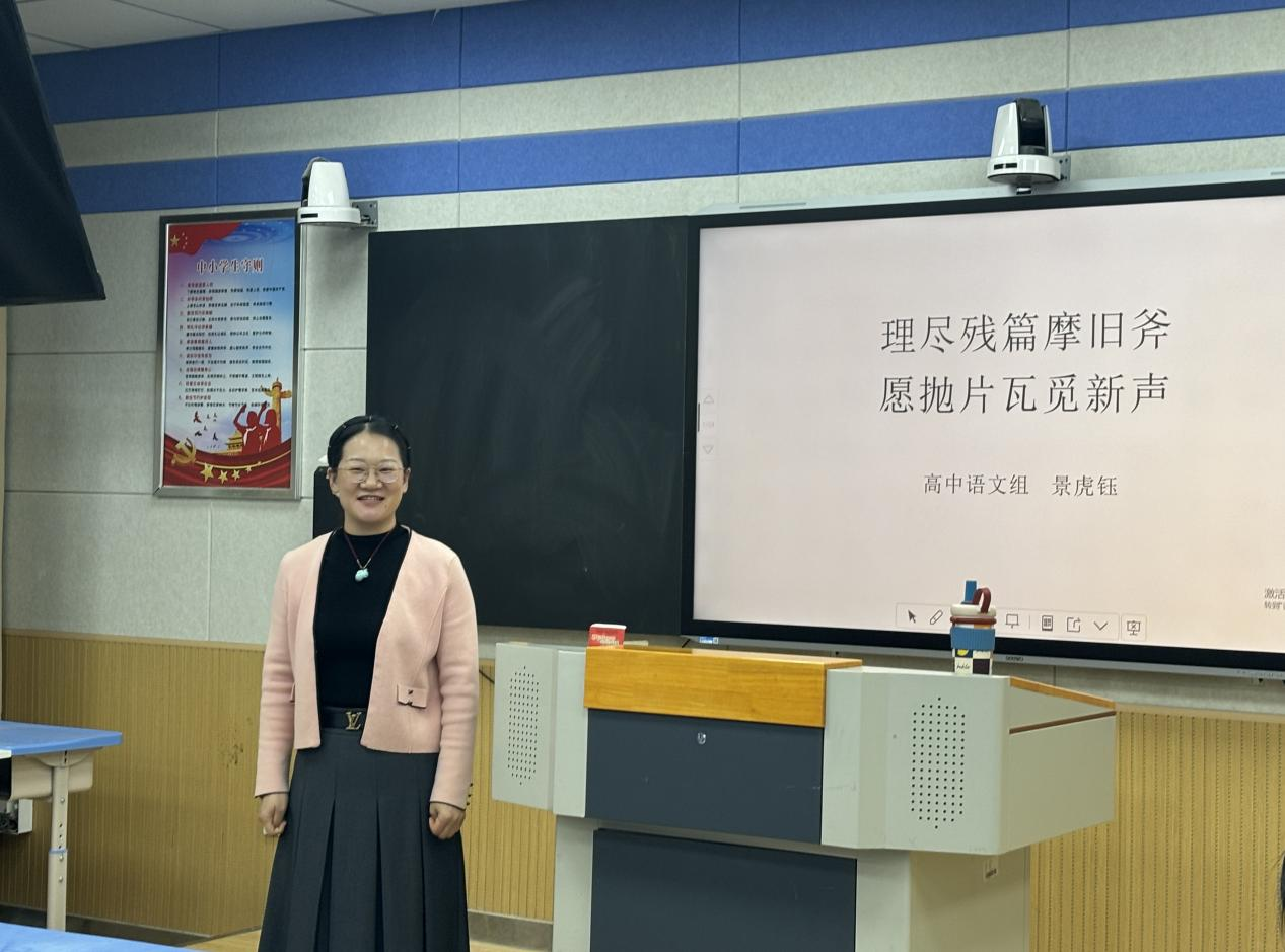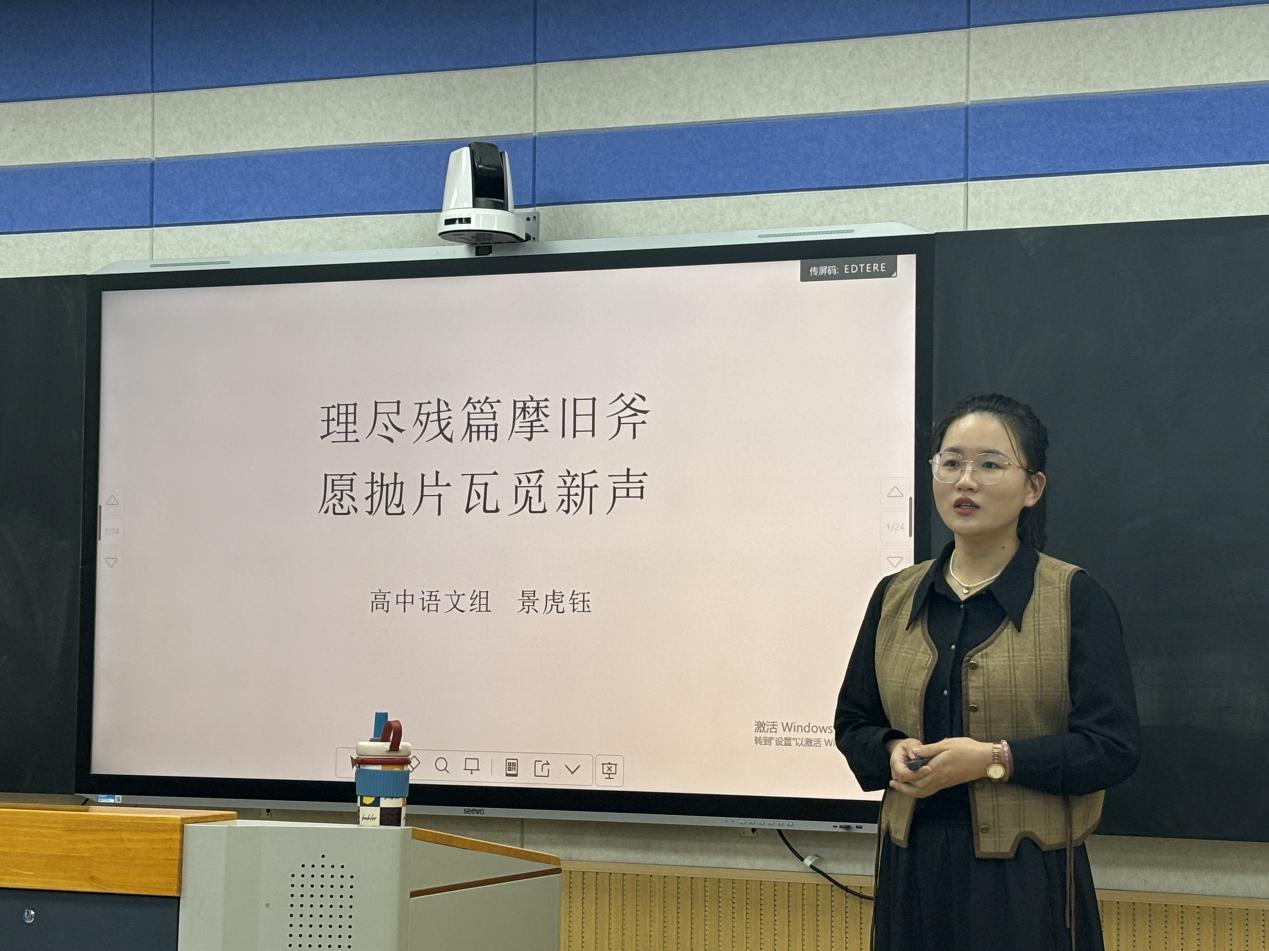 9月22日下午,我校高中语文组在阶梯二教室成功举办“名师领航”讲座分享活动。本次活动由河南省骨干教师、2025年河南省教学技能大赛一等奖获得者景虎钰老师担任主讲人。景虎钰老师以“理尽残篇摩旧斧,愿抛片壁觅新声”为主题,为高中语文组全体教师呈现了一场既扎实又充满温度的专业成长盛宴。