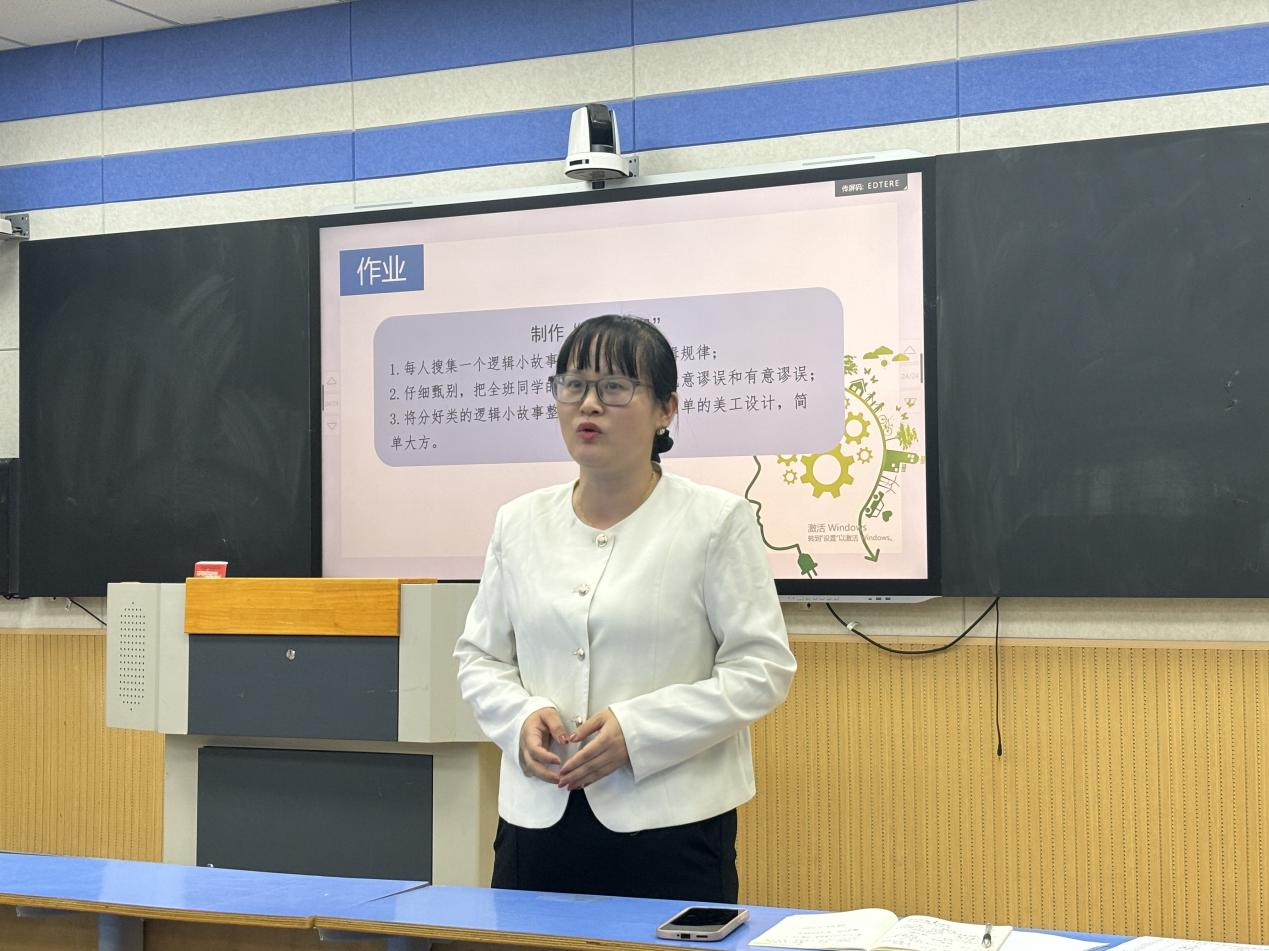 之后,景虎钰老师无私分享了她的课堂设计理念,以"角度新、挖掘深、形式美"为标准,通过文本素读激发灵感,借助资料搜集理清思路。她以"谁偷了我的外卖——发现潜藏的逻辑谬误"为例,详细讲解了课程构思的全过程,为老师们提供了宝贵的教学启示,也获得了史晓萍老师的高度肯定和赞誉。