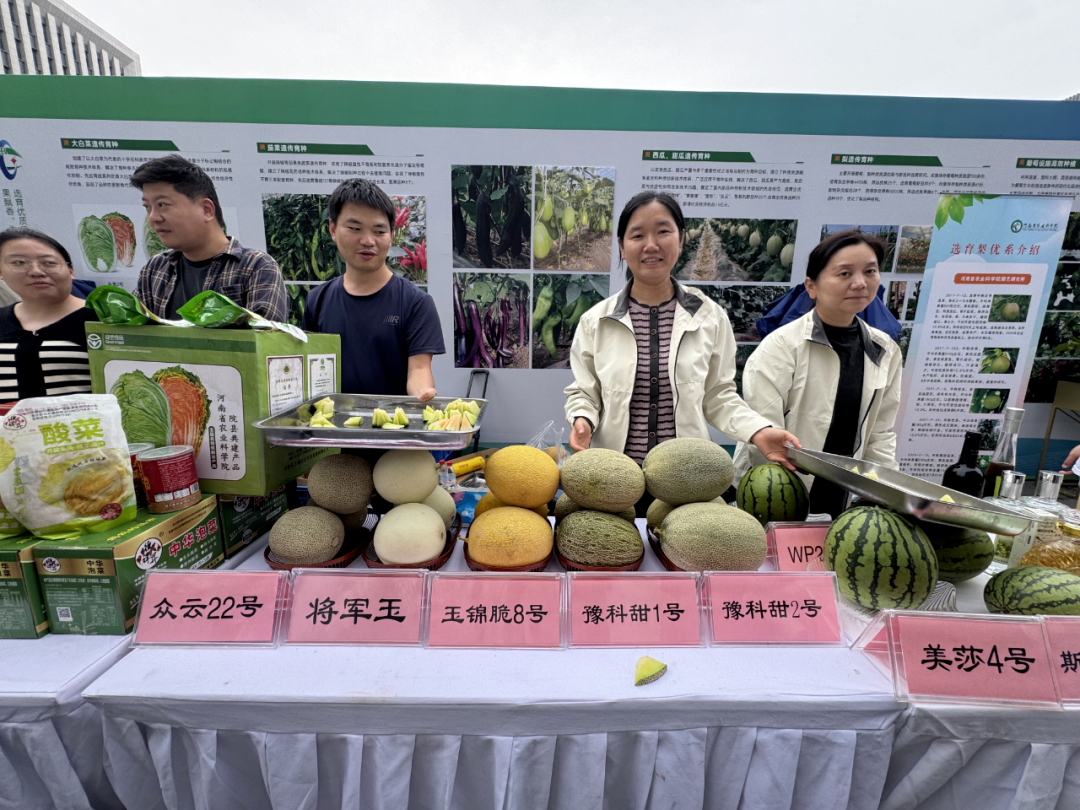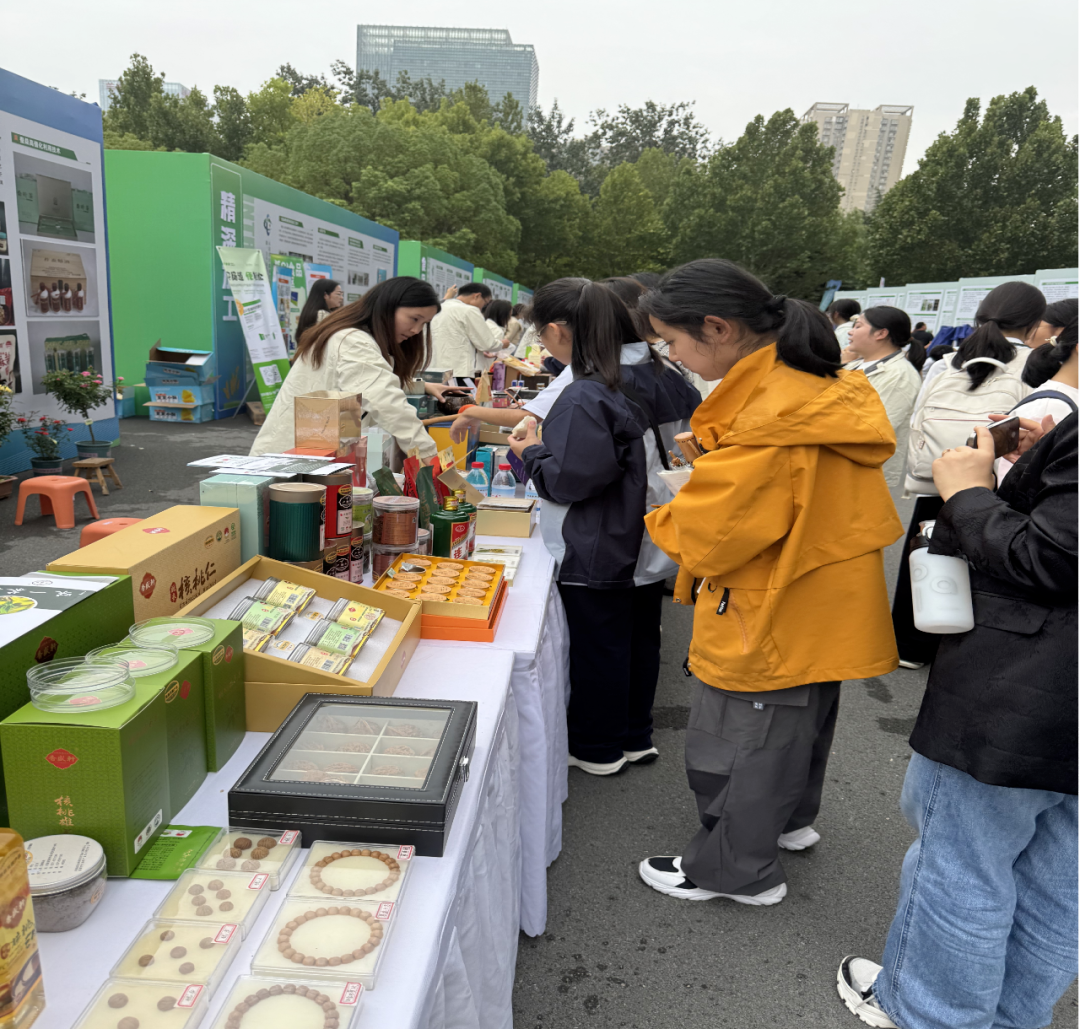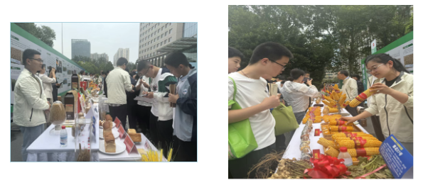 随后师生们移步至楼前广场的8个现场展会区,一场农业科技的 “盛宴”正式拉开帷幕。该展区共设有种业芯片、果蔬飘香、林果花卉、食药同源、精深加工、食品安全、绿色防控、智慧农业8个展区,集中展示了全省农业领域102个新品种、65项新技术、30项新产品。在“种业芯片”展区,颗粒饱满的玉米种子、色泽鲜亮的水稻种子被装在透明罐中,“豫花37号”花生根系带土、果实累累。同学们或埋头记录“百果重”“出仁率”等育种数据,或追问玉米亩产优势。科研人员向大家介绍:“这些种子是农业‘芯片’,好种子让庄稼更高产优质。”当得知郑单系列玉米亩产超千斤、郑麦品种提升河南小麦品质时,同学们眼中满是惊叹,真切感受到“一粒种子改变世界”的力量,也在心中埋下关注农业科技、守护粮食安全的种子。