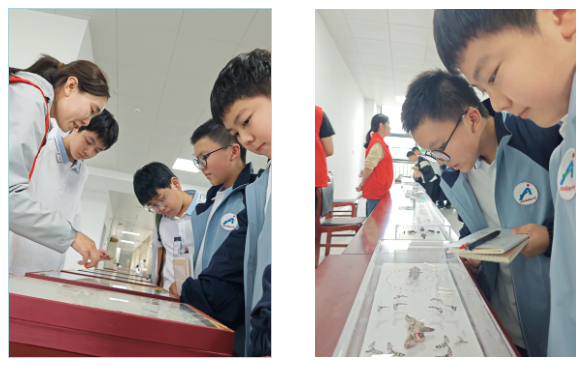 刚进入农科院综合大楼的昆虫和植物标本展厅,同学们的目光便被展区内陈列的新奇展品所吸引。展厅内,数十件昆虫标本整齐陈列,色彩斑斓的凤蝶标本翅膀泛着金属光泽,天牛的复眼在灯光下清晰可辨,蜜蜂绒毛上还“沾着”模拟花粉——这些平日里只在课本插图中见过的生物,此刻以立体、鲜活的姿态呈现在眼前,让同学们忍不住驻足观察,纷纷拿出笔记本记录细节。同学们边观察边记录细节,还时不时与同伴分享发现的“小秘密”。