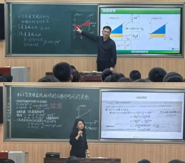 郭鑫老师与刘甲男老师围绕同一教学内容,均以我国福建舰舰载机起飞、降落为核心情境,巧妙融入科学态度与责任素养培育,既借助国防科技案例深化学生对物理观念的理解,又引导学生解决真实场景中的运动学问题,有效提升科学思维能力,课堂均体现物理学科核心素养的提升。两位教师的设计虽理念同源,却展现出鲜明的教学特色:郭鑫老师通过动手拼图活动,让学生直观感知微元思想方法,同步提升科学探究能力;课程尾声,他播放河南省实验中学航空班学生录制的视频,将家国情怀与学科素养具象化,更创新运用 AI 技术打造可与学生互动的 “伽利略”“刘徽” 数字人,极大点燃了课堂学习热情。刘甲男老师则以 “分组训练 + 涂色展示” 为抓手,践行教师主导、学生主体的教学理念,充分调动学生主动性与课堂效率;课程收尾时,她以舰载机降落时阻拦索的作用为切入点,呼应开篇情境,凸显物理学科学以致用的实践属性。