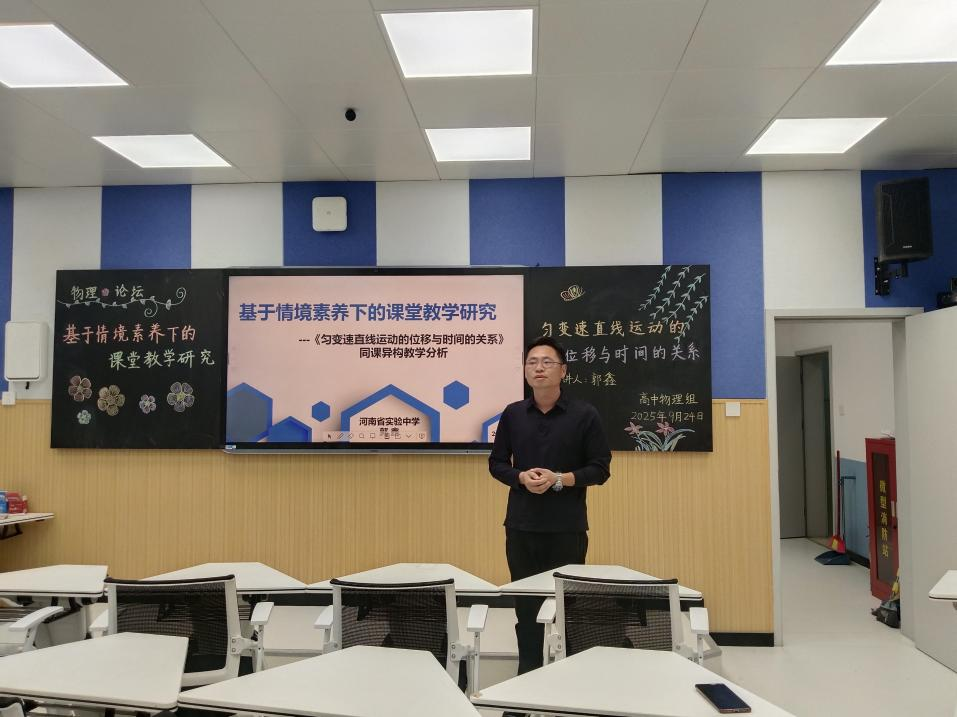 2025 年 9 月 24 日,河南省实验中学高中物理组在物理教学中心成功开展物理论坛活动。本次论坛特邀高一物理组郭鑫老师主讲,以《基于情境素养下的课堂教学研究》为主题,结合《匀变速直线运动的位移与时间的关系》教学案例,深入剖析同课异构的实践路径与育人价值。河南省实验中学郭鑫老师和内蒙古呼伦贝尔阿荣旗一中的刘甲男老师的精彩授课作为同课异构的案例展示。