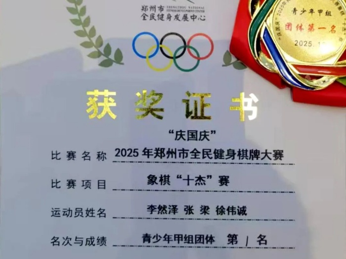 10月3日,2025 年郑州市象棋“十杰赛”火热开赛。作为“庆国庆”郑州市全民健身棋牌大赛的重要组成部分,本次赛事吸引了来自北京、山西、甘肃、河南等地的120余名顶尖棋手参赛,其中不乏全国青少年锦标赛获奖选手与象棋“棋协大师”等高水平竞争者。我校代表队在李福军老师带领下参战,面对多轮高强度对决,队员们沉着应战,在布局构思中展现全局视野,于中盘博弈中彰显应变智慧,最终以优异战绩强势登顶,将青少年甲组团体第一名奖牌收入囊中。