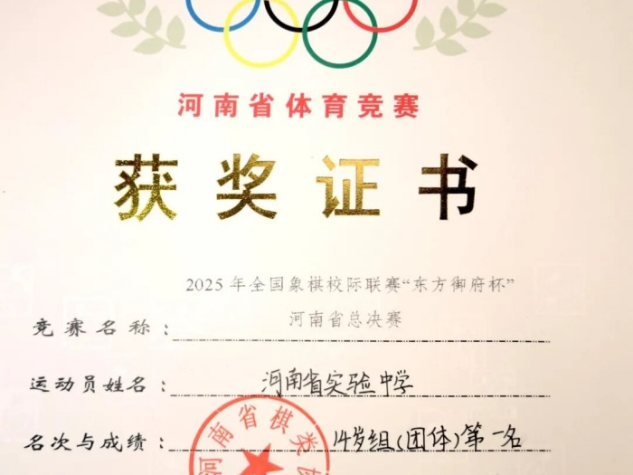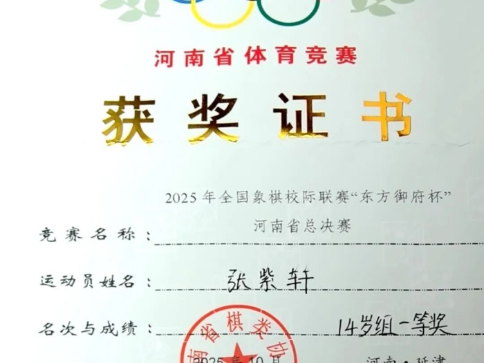 楚河汉界勇博弈,金秋赛场显峥嵘。国庆节期间,我校学生接连组队参加2025年郑州市象棋“十杰赛”与河南省校际联赛总决赛,先后斩获郑州市青少年甲组团体冠军与河南省14岁组团体冠军,张紫轩同学摘得省赛14岁组一等奖桂冠,以三冠荣耀为国庆献礼。