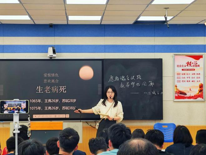 吴月圆老师则以苏轼《江城子·乙卯正月二十日夜记梦》为载体,紧扣“寻‘梦’理情、以‘声’悟情、解‘梦’结情”三大教学任务,层层深入引导学生走进苏轼的悼亡深情。巧妙串联“十年生死两茫茫”的时空怅惘、“小轩窗,正梳妆”的白描幻境与“明月夜,短松冈”的对写哀思,通过梳理“梦前-梦中-梦后”行文脉络,拆解“虚实结合”“白描”“对写”等高考核心手法,让学生在朗读品悟中感受诗词的语言美、情感美。同时,结合苏轼与王弗的生平轶事、仕途境遇,教师们引导学生深挖“尘满面,鬓如霜”中的人生况味,将“亡妻之痛、故土之思、仕途之苦”的多重凄凉具象化,实现了“知识传授”与“情感共鸣”的深度融合。