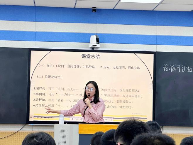 樊丽娜老师以《设问反问:让论证锋芒毕露》为主题,在课上以“诊断—鉴赏—实践”为脉络:课始,她以“界限与成长”作文题为例,呈现两组反差鲜明的论证语段,组织学生开展诊断活动。通过表格从“分论点表述、事例陈述、论证逻辑、语言表达”四维度对比,让“论证之困”清晰可见,也让课堂目标精准落地——用设问、反问破“平”立“锋”。为让抽象的论证技法具象化,樊老师又以《论持久战》节选为经典范本,引导学生领悟:设问“自问自答,直击核心观点”,可破“观点模糊”之弊;反问“无疑而问,强化立场”,能解“论证无力”之困,为后续运用筑牢基础。最后,樊老师以“界限与成长”“信任与童年”两组优化语段为案例,让学生在合作中提炼出适配不同论证环节的句式,强化逻辑。清晰的方法总结,让“问句技法”从“不可捉摸”变为“可学可用”,尽显青年教师化繁为简的教学智慧。
