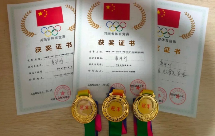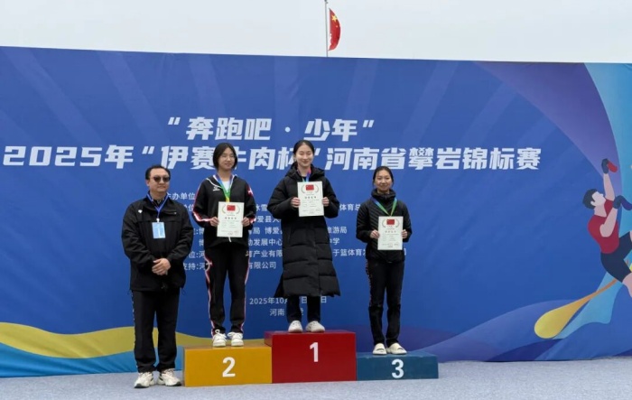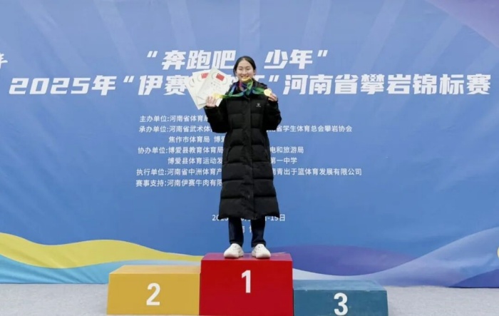 10月17日—19日,由河南省体育局主办的“奔跑吧·少年”2025年河南省攀岩锦标赛在焦作举行。一级运动员、我校廖珅妤同学在比赛中发挥出色,夺得甲组女子速度赛、难度赛和攀石赛三项冠军,实现该组别全满贯。