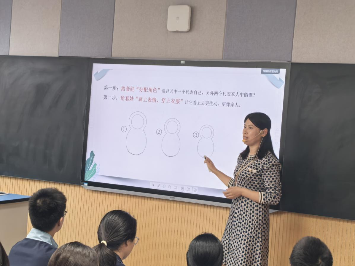 在课堂观摩环节,河南省实验中学的朱丽老师为参训老师呈现了一节初一年级的《品味亲情》课程。整堂课以艺术表达为载体,将抽象的情感具象化,“盲盒线索寻人” 环节便勾起了学生们的兴趣,不少学生眼中泛起微光,亲情的种子悄然萌发。“家庭套娃绘制” 中,学生们手握彩笔,认真勾勒着父母的模样,品味亲情的流动。当 “家的瞬间” 视频播放,让学生在创作与分享中深化对亲情的理解。参训教师纷纷表示:“这堂课没有生硬的说教,却让学生在体验中自然成长,真正做到了‘润物细无声’。”