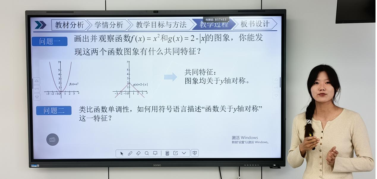 郭淇老师说课内容为函数的奇偶性,从教材、学情、目标、重难点、教法学法、教学过程六个方面展开,重点分析了教学过程。首先让学生画出并观察两函数图象,并总结出共同特征:图象均关于y轴对称;随后引导学生类比单调性,用符号语言描述“图象均关于y轴对称”。在生成概念时让学生经历从特殊到一般的过程,得到猜想并证明,借助geogebra软件让学生观察在点移动过程中,始终保持该点及其对称点的横坐标互为相反数,纵坐标不变,从形的角度说明猜想的正确性,并从数的角度带领学生证明猜想。从而生成偶函数的概念,带领学生辨析关键词,感受奇偶性的整体性意义。随后通过典例,利用定义证明函数的奇偶性,并归纳出一般方法。最后进行课堂小结,分层布置作业,使全体学生能够掌握基础知识,使学有余力的学生进一步得到拓展、拔高。
