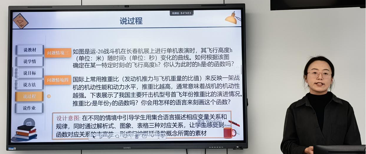 黄楚棋老师针对函数的概念第一课时展开说课,主要围绕教材分析,学情分析,教学目标,教法学法,教学过程和板书设计六个方面进行分析。在教学设计方面,首先带领学生回忆旧知—初中阶段函数的概念,设置问题激发认知冲突,让学生意识“变量说”的不完整性,感受进一步学习函数概念的必要性。接着播放2025年长春航展的高燃片段,设置四个与长春航展有关的问题情境,通过问题链的方式推动课堂,使学生认识到用集合语言和对应关系重新定义函数的必要性,引导学生从具体问题中抽象出函数概念,提升学生抽象概括,归纳总结,数学表达能力,培养学生数学抽象的核心素养。得到函数概念后,设置四个题组练习,进一步深化对函数概念的理解。最后,画龙点睛,总结函数概念,训练学生从具体知识上升到抽象思维的能力,分层布置作业,给不同层次的学生留有发展空间,践行“以人为本”的育人理念。