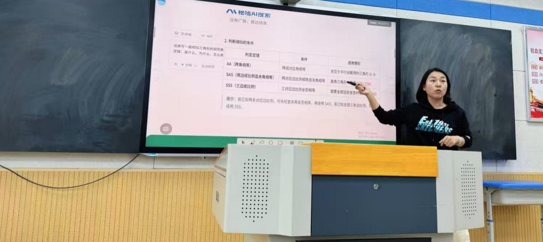 孙秋玲老师结合 2025 年中原名师工作室省级名师培育对象培训班的学习内容,聚焦 “AI 赋能课堂” 主题展开分享。她首先分类介绍适用于数学教学的生成式 AI 工具,如生文类(豆包、DeepSeek 等,可辅助设计教案、生成练习题)、生图类(即梦 AI,用于制作几何示意图)、交互式演示类(DeepSeek 网页版,支持二次函数、一次函数动态图像生成与参数调整),并现场演示秘塔 AI 搜索生成 “相似三角形判定” 教学思路的操作,直观呈现 AI 工具提升备课效率的具体方式。