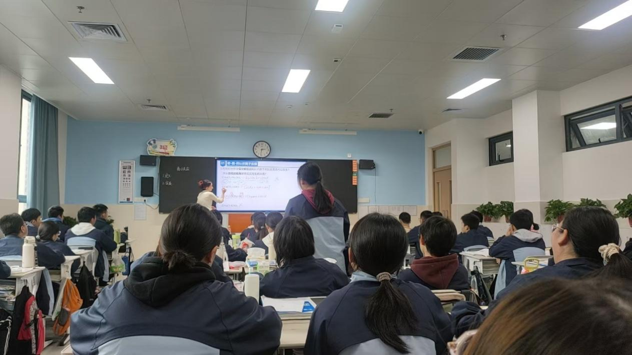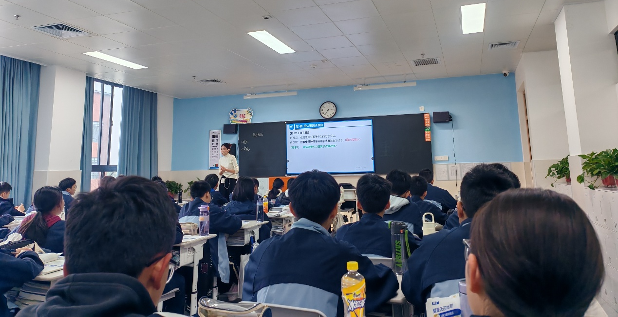 袁老师以饱满的教学热情、严谨的教学逻辑和灵动的师生互动,充分展现了新时代青年教师的教学风采。课堂以习题回顾为切入点,从化学反应的宏观现象出发,引导学生深入思考其微观本质。在教学过程中,袁老师巧妙运用AI对课堂进行赋能,借助DeepSeek生成稀硫酸与氢氧化钡溶液反应的微观动画,生动呈现了离子间相互作用的过程,使学生直观理解“离子反应”的实质,自然引出核心概念。整节课坚持以学生为主体,通过多次小组讨论、问答互动及自主总结,层层推进,既激发了学生的思维活力,也体现了袁老师扎实的学科功底与出色的课堂驾驭能力。
