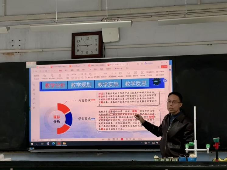 活动中,王老师围绕全国初中化学课堂展示课的核心亮点展开分享。本次全国初中化学说播课展示聚焦“情境驱动、实践育人”,呈现了多节特色鲜明的优质课例。例如北京课例以“汽车车身材料的轻量化设计”为真实项目,通过“初步感知—查阅资料—实验验证”的环节,引导学生探究合金与纯金属的差异,渗透绿色环保的学科价值;安徽荆州课例则以“楚文化”为线索,设计“‘楚’字设境—‘楚’铜探秘—‘楚’人励志”的教学流程,串联“炼粗铜、观青铜、析铜渣”等探究任务,将金属材料内容与文化传承、工艺发展深度融合。