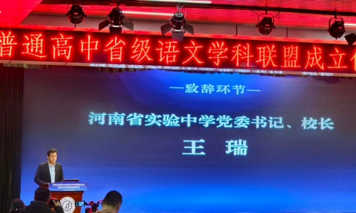 我校党委书记、校长王瑞在致辞中表示,我校高中语文学科荣膺河南省一级语文学科基地,深耕教研,辐射带动,成果丰硕,发挥了积极的示范引领作用。期望建成一个汇聚智慧、共享资源、协同攻关、共生共长的资源平台,期待所有成员学校借助这个平台加强交流、深度合作、切磋琢磨、互学互鉴,共同推动河南省高中语文教育质量节节攀升,为我省基础教育高质量发展贡献语文力量、人文智慧,为全省学子提供更优质的语文教育。