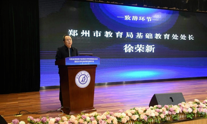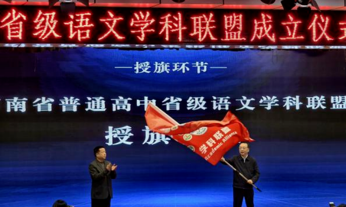 河南省基础课程与教学发展中心党委书记、主任,河南省基础教育质量检测中心主任赵阳热烈祝贺联盟成立,并为联盟授旗,标志着河南省普通高中省级语文学科联盟正式扬帆启航。郑州市教育局基础教育处处长徐荣新代表郑州市教育局致辞,表示郑州市教育局将全力支持联盟建设。