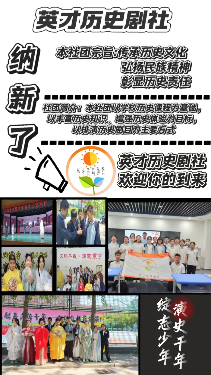 历史剧社作为一种有趣的形式成为课堂教学不可或缺的补充,研讨剧本和历史剧表演涉及到语文、音乐、表演等多学科的知识,顺应了当下跨学科的学习的潮流,必将为历史教学打开一扇新的大门!期待英才历史剧社接下来的精彩!