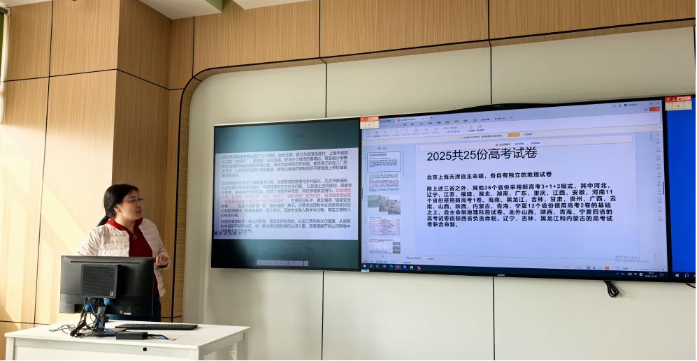 活动伊始,杨莉莉老师以 “2025 年河南高考地理题情境分析与教学启示” 为主题开启小讲座。她围绕河南高考卷设置的南水北调、浙江东部海岛渔村、上海市老龄人口与 “年轻环” 等九个鲜活情境,深入剖析其背后蕴含的国家重点工程关注、传统聚落与乡村振兴关联、节能减排与生态城市建设等学科思想与家国情怀。