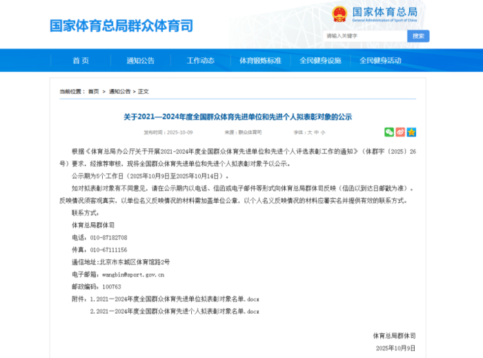 今年10月,经逐级推荐审核,我校荣膺“2021—2024年度全国群众体育先进单位”。