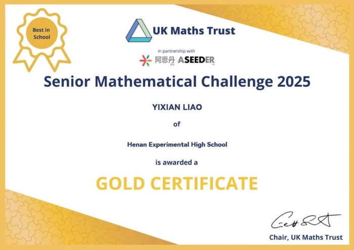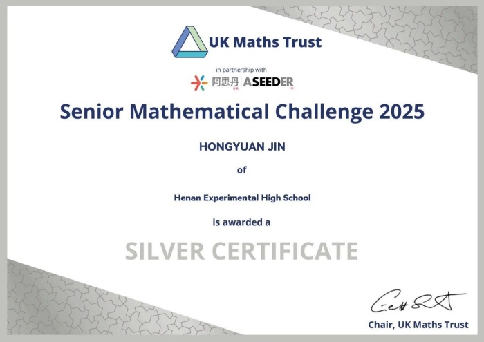 英国数学测评(高级)(UKMT-SMC)是英国规模最大、最具影响力的中学数学思维挑战活动之一。作为英国数学奥林匹克国家队选拔的重要渠道,该赛事每年吸引全球众多优秀学子参与,本届赛事于2025年10月10日举行。此次优异成绩的取得,既源于廖一娴、金洪源同学长期的努力和赛场上的稳定发挥,也离不开指导教师和数学教研组的辛勤付出,更体现了我校在数学拔尖创新人才培养方面的扎实成效。学校向获奖同学和指导团队表示热烈祝贺与诚挚感谢,期待更多学子在未来国际舞台上继续绽放光彩!