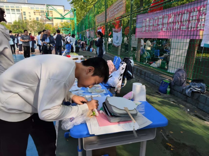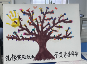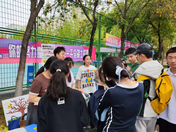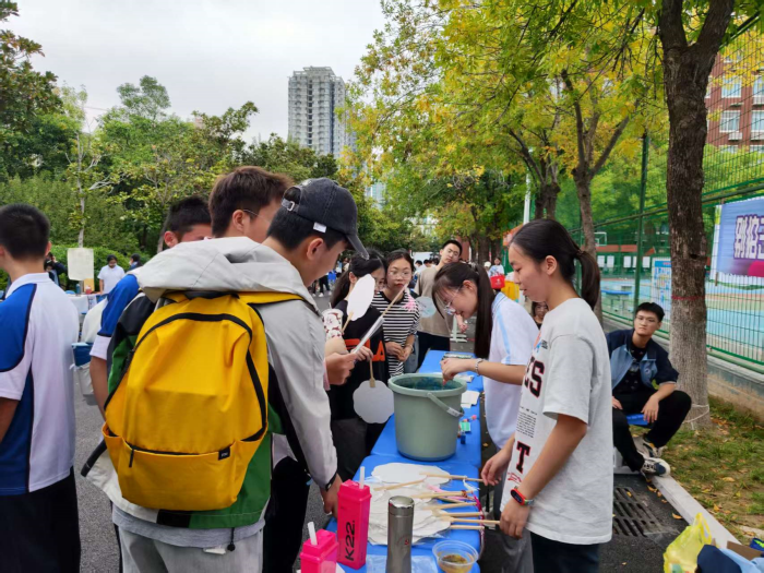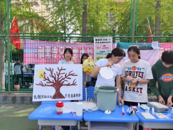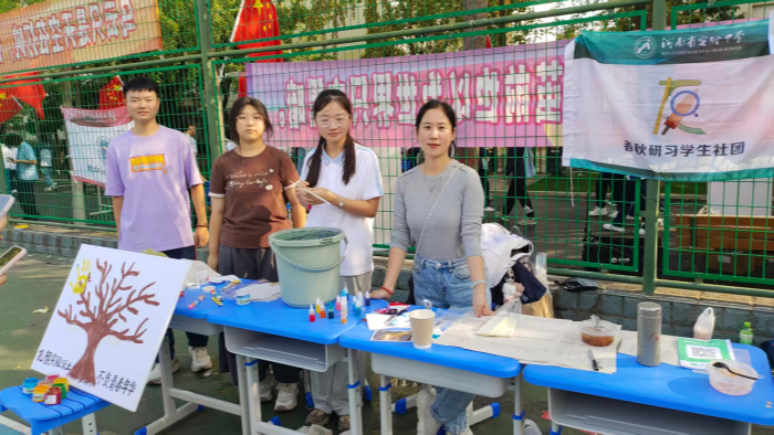 最引人注目的当属摊位旁的 “打卡树”。早已绘制好的“实验树”的苍劲有力的树枝上被同学们印满手印,同学们参与漆扇、书签制作后,在打卡树上留下属于自己的历史一刻。随着指印不断增多,“打卡树”渐渐变得五彩斑斓,成为市集里一道独特的风景线,也让招新活动充满了活泼的氛围。