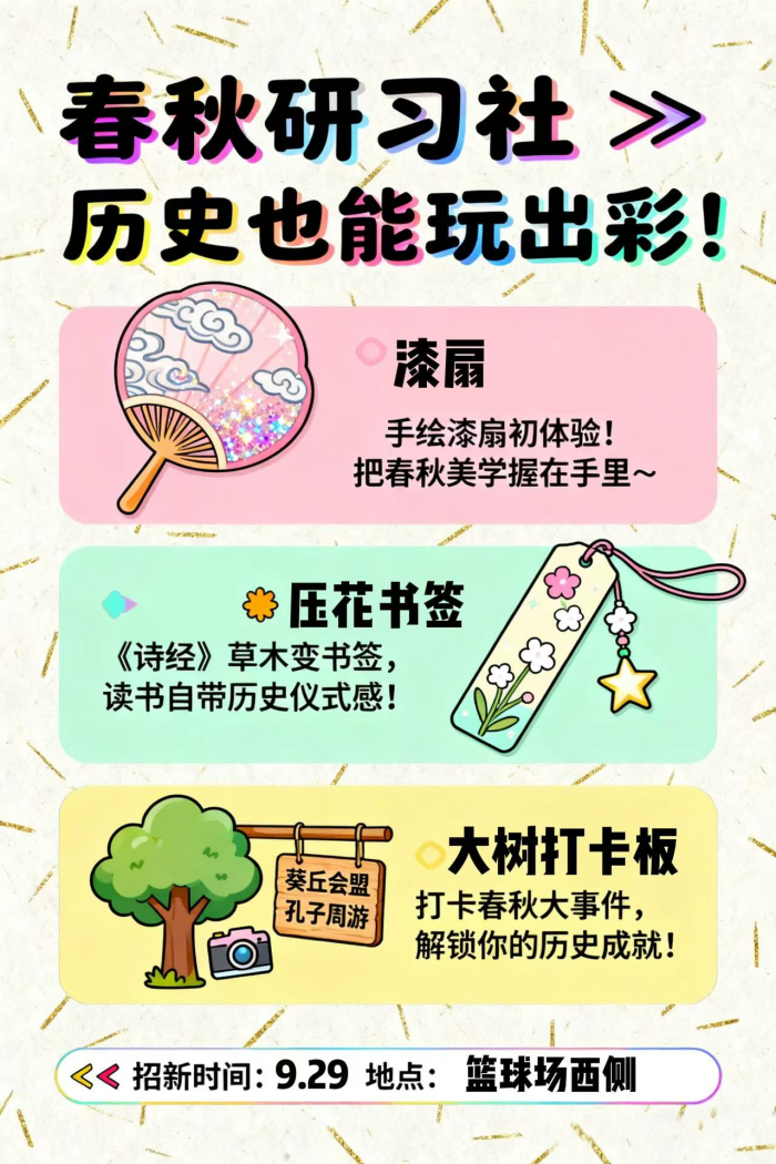 招新工作的圆满结束,是春秋研习社发展道路上的一个重要里程碑。我们不仅壮大了队伍,另外吸引众多对历史、国学、传统智慧充满热情的新同学加入。让我们携手新社员,共同在历史的长河中探寻智慧,在思想的碰撞中启迪未来,将春秋研习社建设成为一个更有活力、更有深度、更有温度的学术共同体。