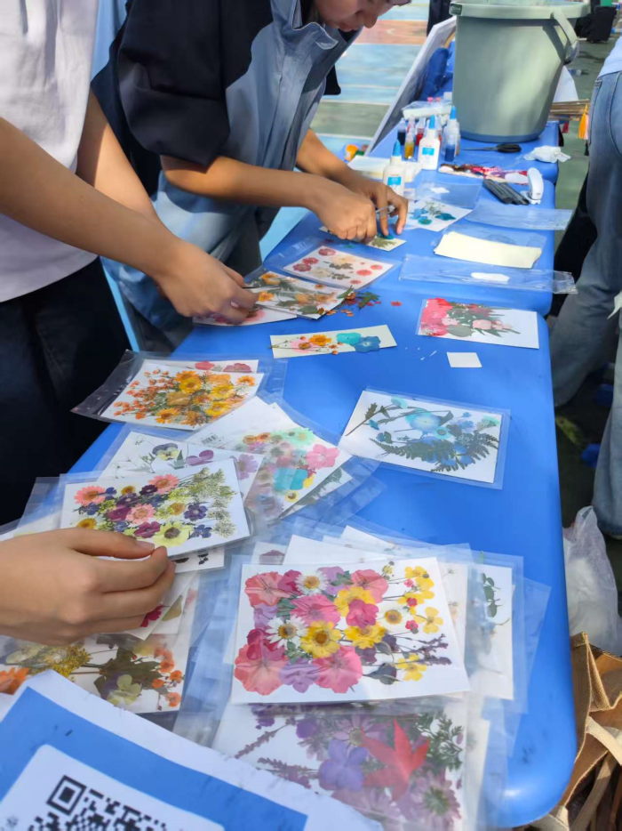 一旁的压花书签制作区同样人气高涨。干花材料整齐摆放,胶水、卡纸等工具一应俱全,社员们有序地为同学们讲解制作技巧。挑选喜爱的干花,精心搭配构图,再用胶水固定,一枚枚精致的压花书签便成型了。“这个书签既有自然之美,又能记录学习时光,太有意义了!” 刚完成制作的同学举着书签开心地说。